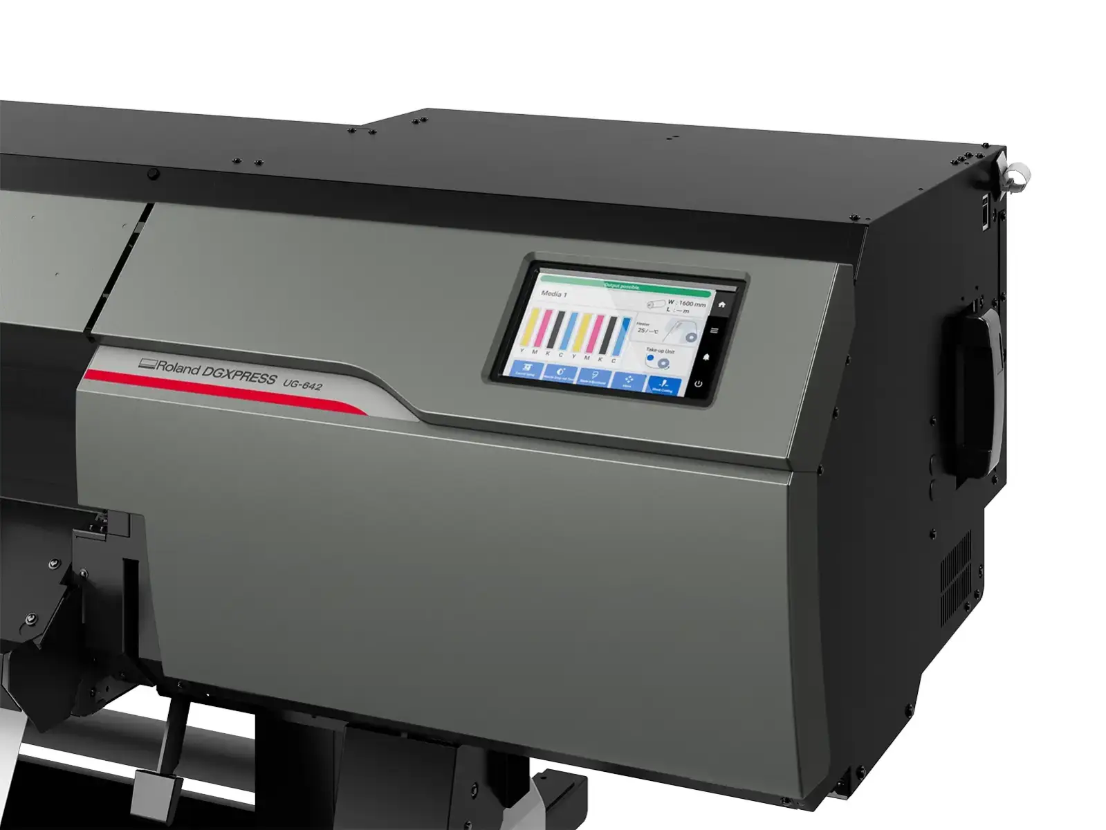 Model UG-642 posúva možnosti série UG na vyššiu úroveň — s väčšou kapacitou atramentových cartridge 750 ml, automatickým navijacom médií (take-up unit) a dotykovým displejom pre komfortné riadenie dlhých tlačových behov.