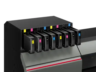 Biela farba pre tlač na transparentné a tmavé médiá Konfigurácia CMYK + Biela + Lesk rozširuje produkčné možnosti o tlač na priehľadné, tmavé a metalické médiá — pre prémiové okenné grafiky, polepe a špeciálne tlačové aplikácie.